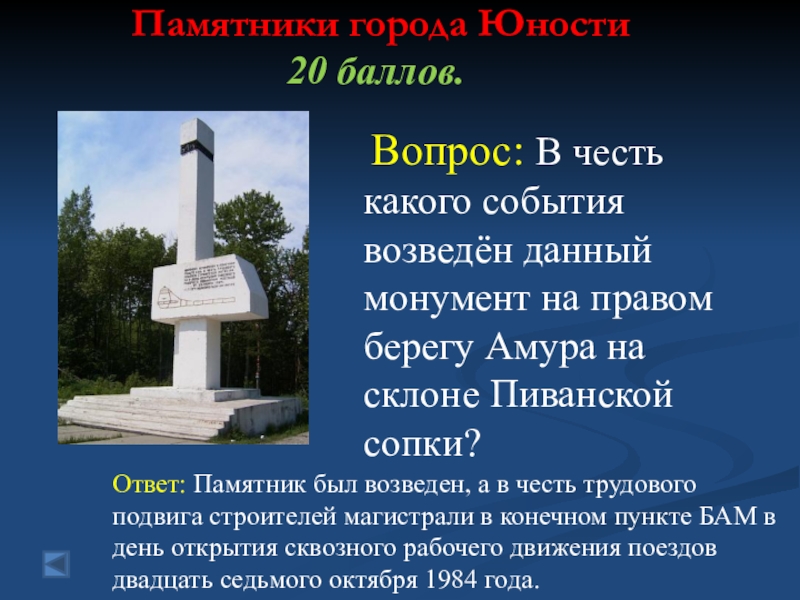 Ответ: Памятник был возведен, а в честь трудового подвига строителей магистрали в конечном пункте БАМ в день открытия сквозного рабочего движения поездов двадцать седьмого октября 1984 года.