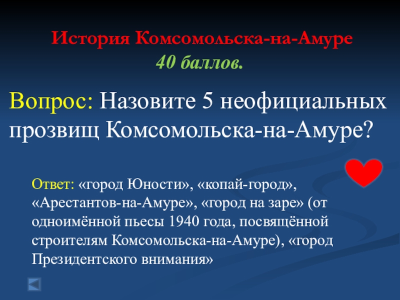 Ответ: «город Юности», «копай-город», «Арестантов-на-Амуре», «город на заре» (от одноимённой пьесы 1940 года, посвящённой строителям Комсомольска-на-Амуре), «город Президентского внимания»