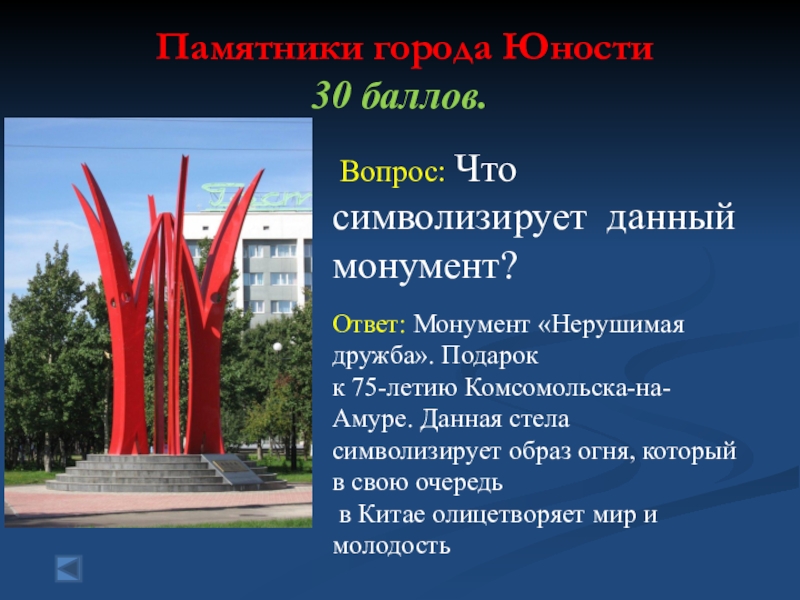 Ответ: Монумент «Нерушимая дружба». Подарок