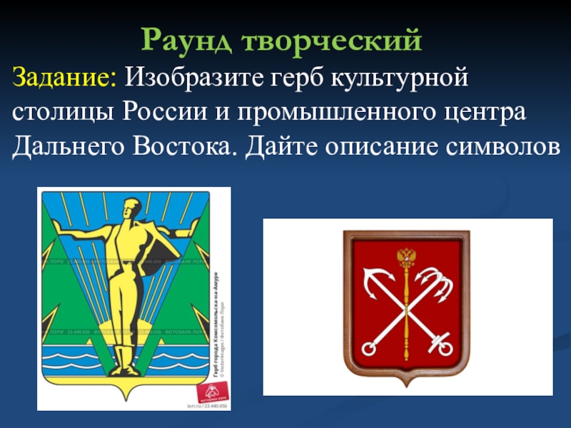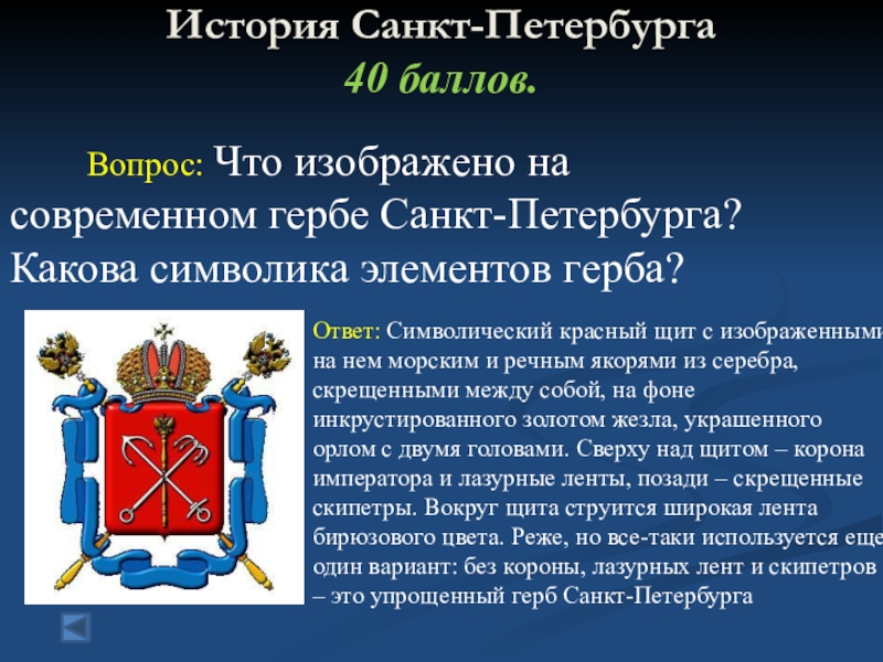 Ответ: Символический красный щит с изображенными на нем морским и речным якорями из серебра, скрещенными между собой, на фоне инкрустированного золотом жезла, украшенного орлом с двумя головами. Сверху над щитом – корона императора и лазурные ленты, позади – скрещенные скипетры. Вокруг щита струится широкая лента бирюзового цвета. Реже, но все-таки используется еще один вариант: без короны, лазурных лент и скипетров – это упрощенный герб Санкт-Петербурга