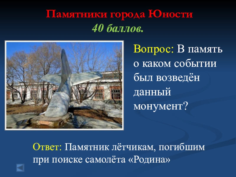 Ответ: Памятник лётчикам, погибшим при поиске самолёта «Родина»
