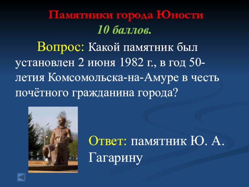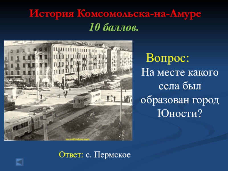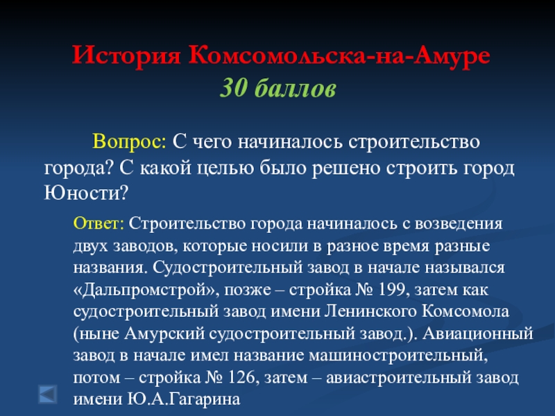 Ответ: Строительство города начиналось с возведения двух заводов, которые носили в разное время разные названия. Судостроительный завод в начале назывался «Дальпромстрой», позже – стройка № 199, затем как судостроительный завод имени Ленинского Комсомола (ныне Амурский судостроительный завод.). Авиационный завод в начале имел название машиностроительный, потом – стройка № 126, затем – авиастроительный завод имени Ю.А.Гагарина