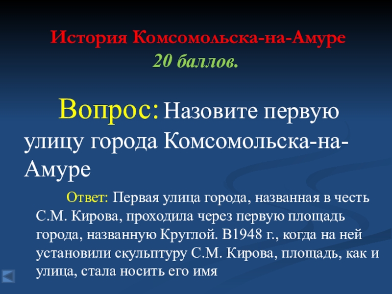 Ответ: Первая улица города, названная в честь С.М. Кирова, проходила через первую площадь города, названную Круглой. В1948 г., когда на ней установили скульптуру С.М. Кирова, площадь, как и улица, стала носить его имя