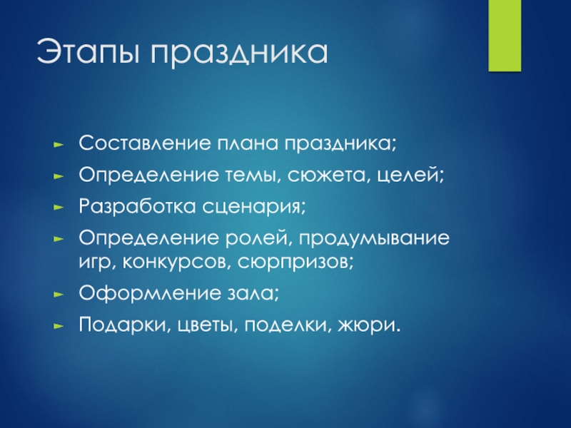 Этапы праздникаСоставление плана праздника;Определение темы, сюжета, целей;Разработка сценария;Определение ролей, продумывание игр, конкурсов, сюрпризов;Оформление зала;Подарки, цветы, поделки, жюри.