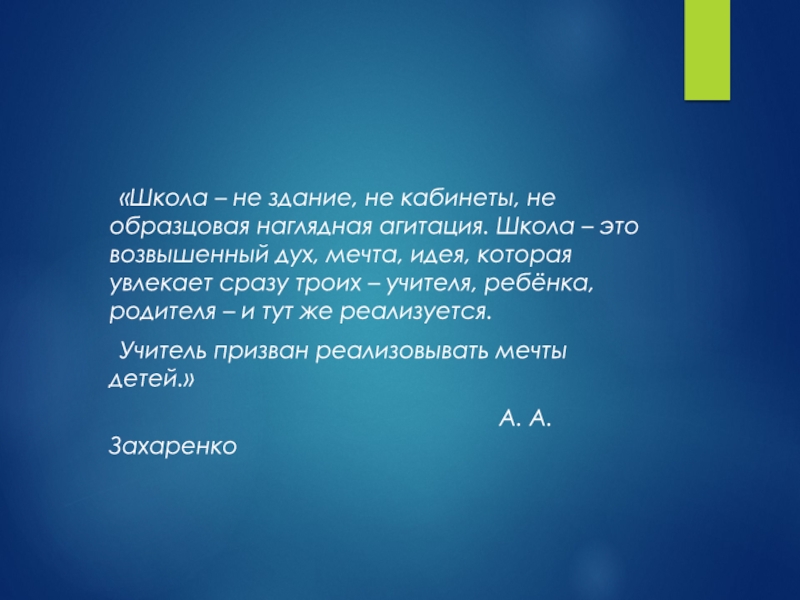 «Школа – не здание, не кабинеты, не образцовая наглядная агитация. Школа – это возвышенный дух, мечта, идея,