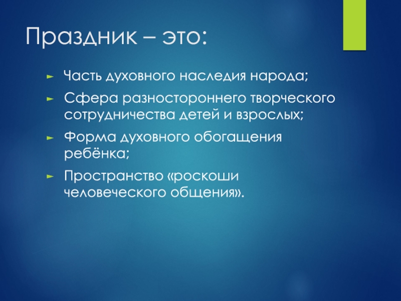 Праздник – это:Часть духовного наследия народа;Сфера разностороннего творческого сотрудничества детей и взрослых;Форма духовного обогащения ребёнка;Пространство «роскоши человеческого
