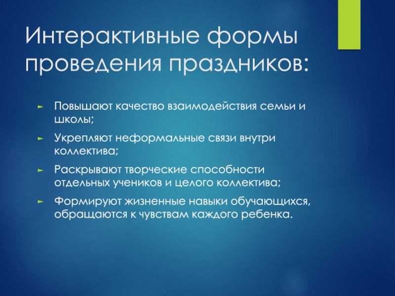 Интерактивные формы проведения праздников:Повышают качество взаимодействия семьи и школы;Укрепляют неформальные связи внутри коллектива;Раскрывают творческие способности отдельных учеников