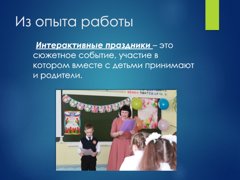 Из опыта работы	Интерактивные праздники – это сюжетное событие, участие в котором вместе с детьми принимают и родители.