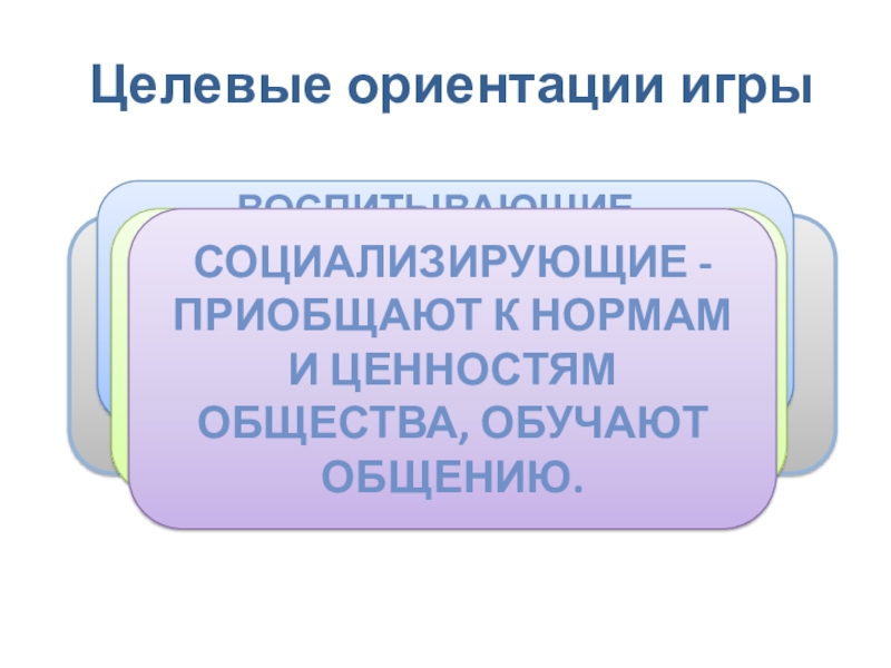 социализирующие - приобщают к нормам и ценностям общества, обучают общению.