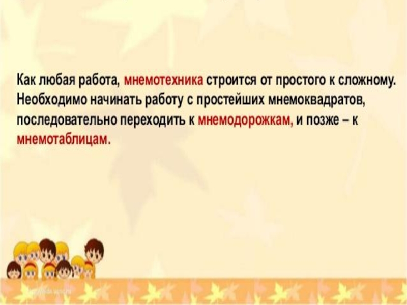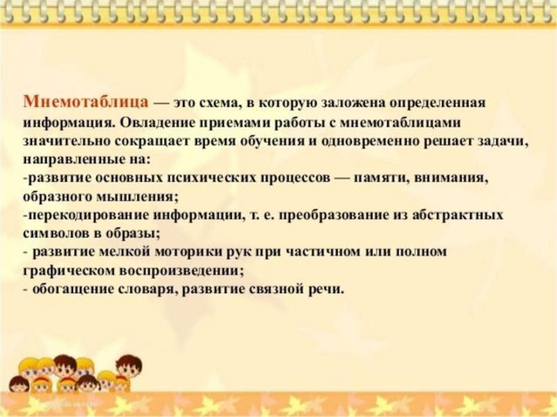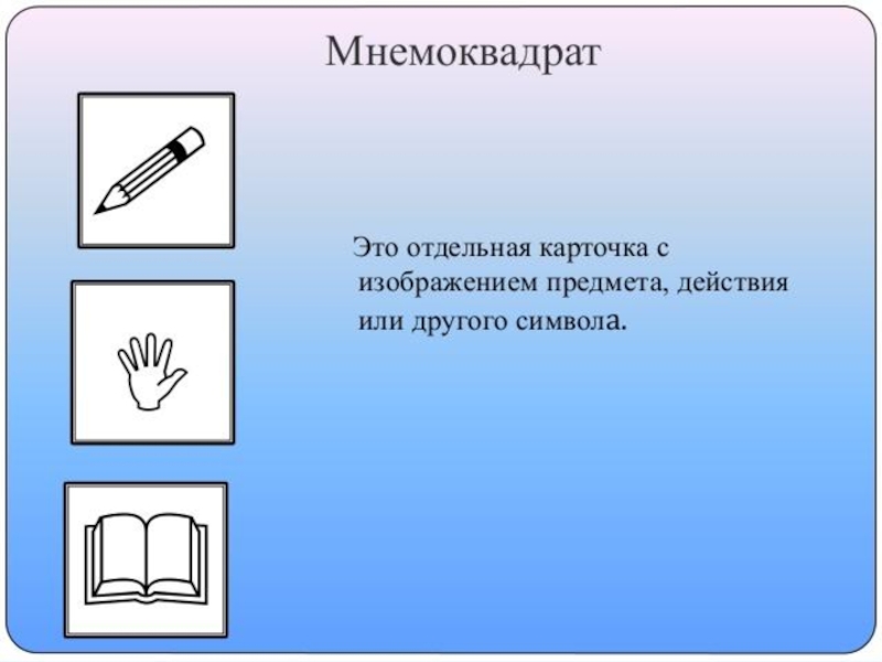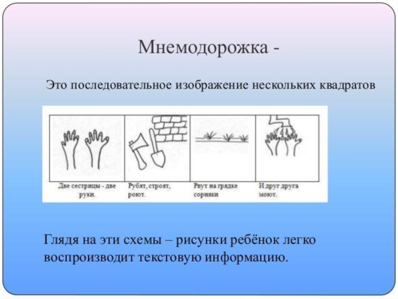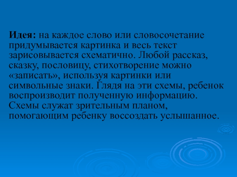 Идея: на каждое слово или словосочетание придумывается картинка и весь текст зарисовывается схематично. Любой рассказ, сказку, пословицу, стихотворение можно «записать», используя картинки или символьные знаки. Глядя на эти схемы, ребенок воспроизводит полученную информацию. Схемы служат зрительным