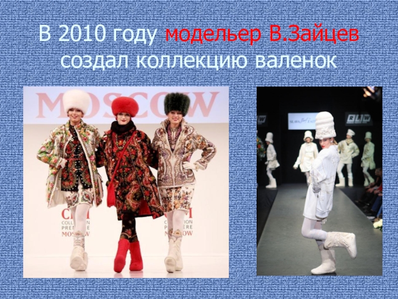 Слайд 59В 2010 году модельер В.Зайцев создал коллекцию валенок