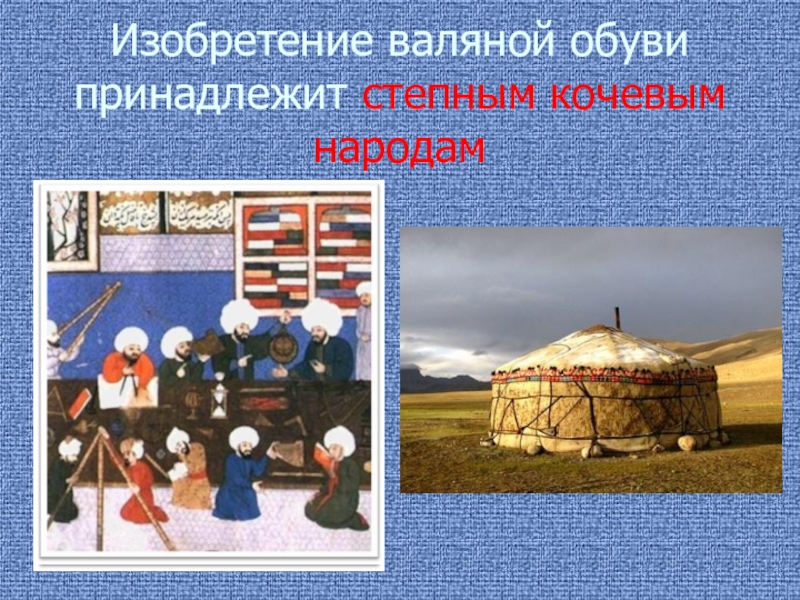 Слайд 11Изобретение валяной обуви принадлежит степным кочевым народам