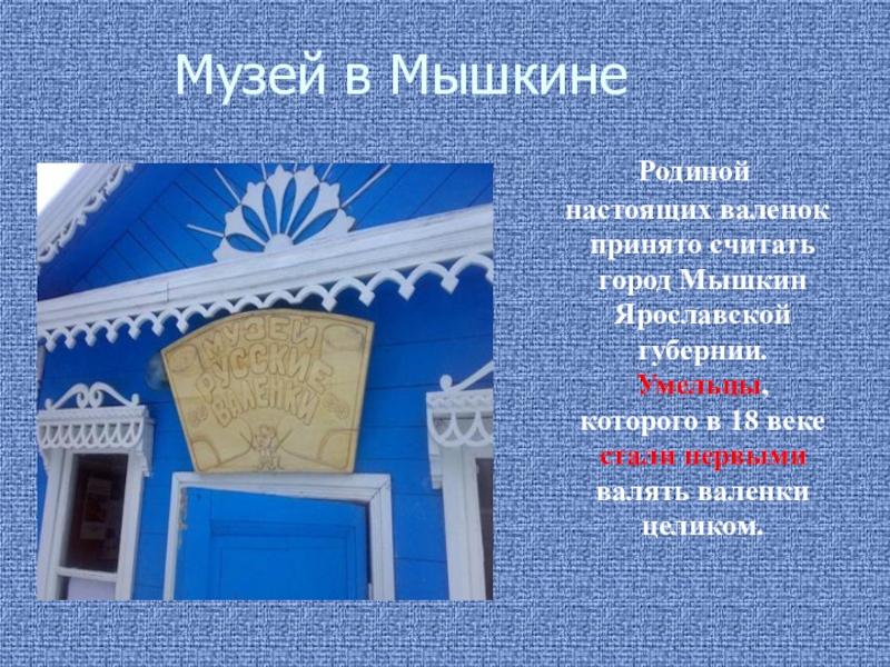 Мышкин Ярославской губернии. Умельцы, которого в 18 веке стали первыми валять валенки целиком.