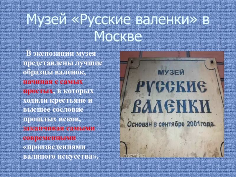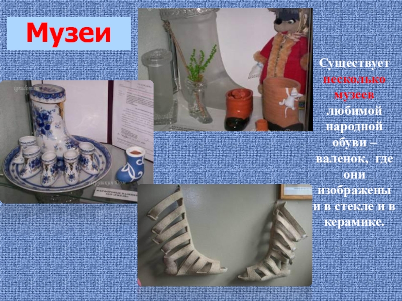 Слайд 41Существует несколько музеев любимой народной обуви –валенок, где они изображены
