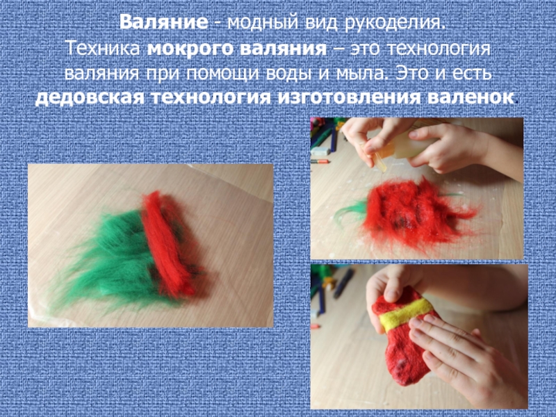 технология валяния при помощи воды и мыла. Это и есть дедовская технология изготовления валенок.