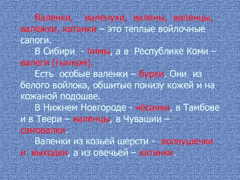 В Нижнем Новгороде - чёсанки, в Тамбове и в Твери – валенцы, в Чувашии – самовалки.