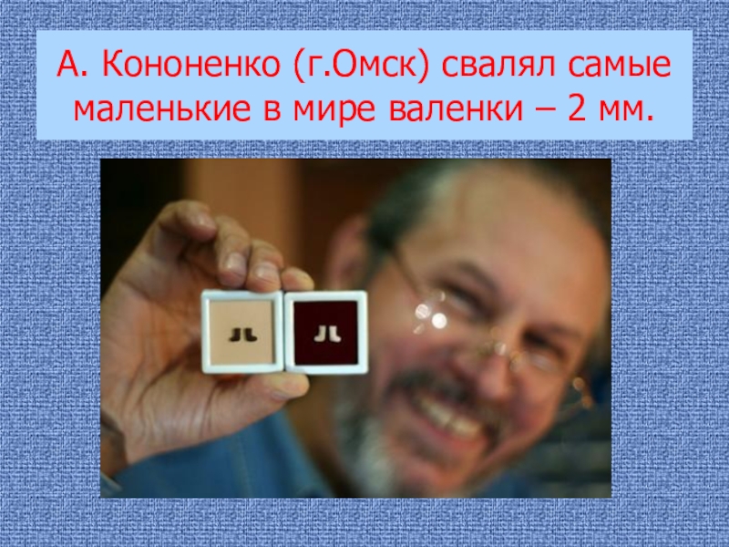Слайд 46А. Кононенко (г.Омск) свалял самые маленькие в мире валенки – 2