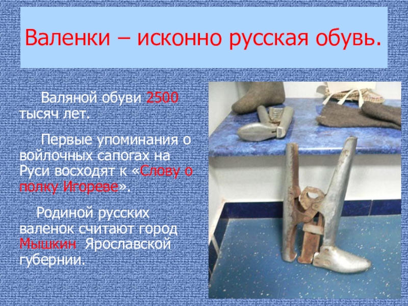 Родиной русских валенок считают город Мышкин Ярославской губернии.