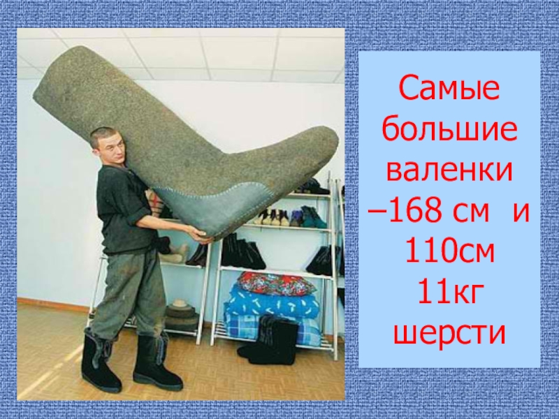 Слайд 47Самые большие валенки –168 см и 110см 11кг шерсти