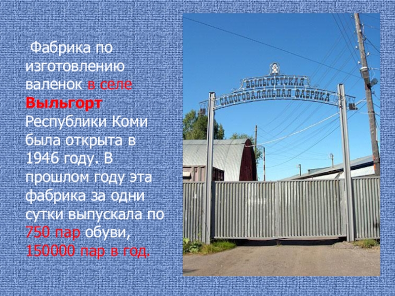 Слайд 51 Фабрика по изготовлению валенок в селе Выльгорт Республики Коми была открыта