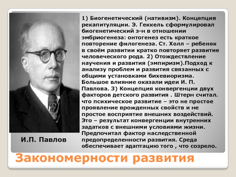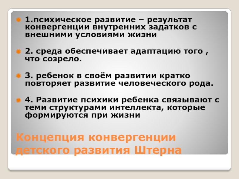 в отношении эмбриогенеза: онтогенез есть краткое повторение филогенеза. Ст. Холл – ребенок в своём развитии кратко повторяет развитие человеческого рода. 2) Отождествление научения и развития (эмпиризм).Подход к анализу проблем и развития связанных с общими установками бихевиоризма. Большое влияние оказали идеи И. П. Павлова. 3) Концепция конвергенции двух факторов детского развития . Штерн считал. что психическое развитие – это не простое проявление врожденных свойств и не простое восприятие внешних воздействий. Это – результат конвергенции внутренних задатков с внешними условиями жизни. Предпочитал фактор наследственной предопределенности развития. Среда обеспечивает адаптацию того , что созрело.