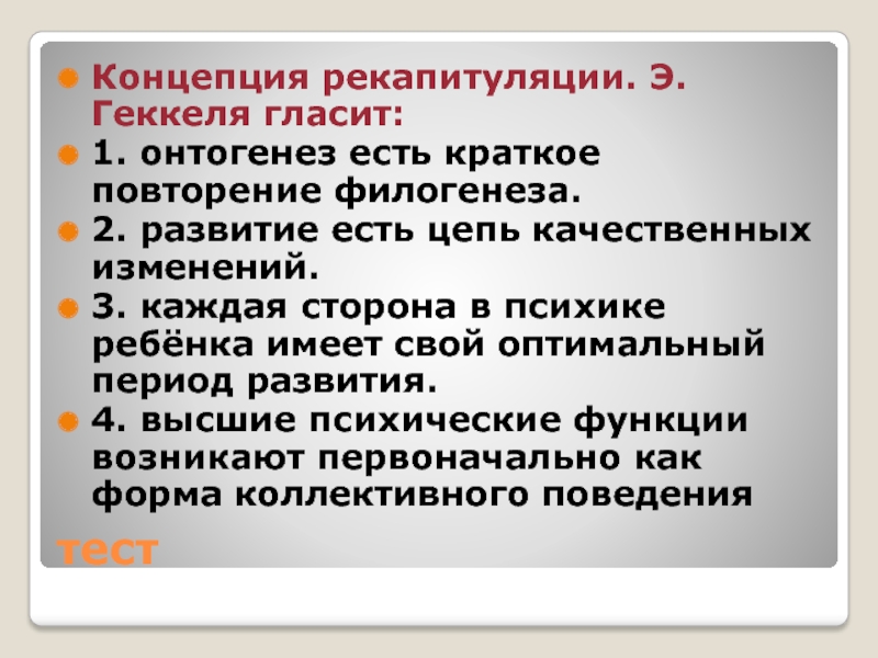 1) Биогенетический (нативизм). Концепция рекапитуляции. Э. Геккель сформулировал биогенетический з-н