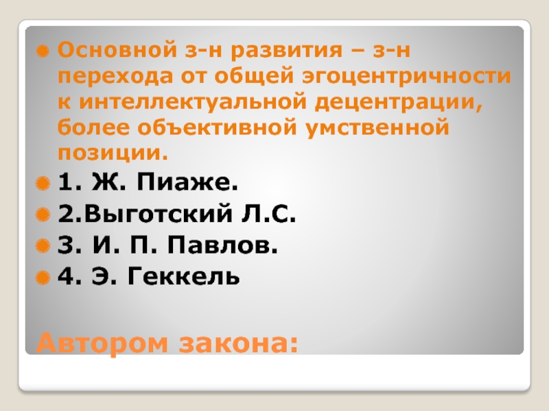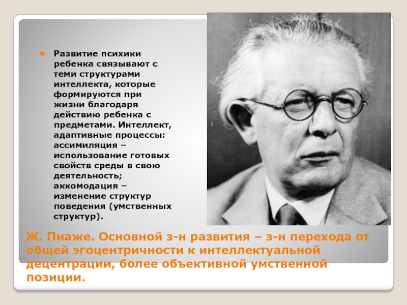 Ж. Пиаже. Основной з-н развития – з-н перехода от общей эгоцентричности к интеллектуальной децентрации, более объективной умственной позиции.