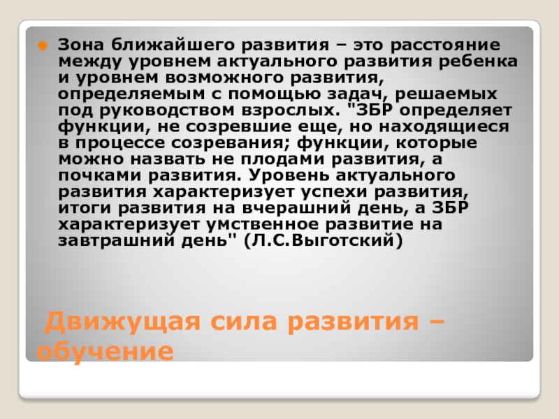 между уровнем актуального развития ребенка и уровнем возможного развития, определяемым с помощью задач, решаемых под руководством взрослых. "ЗБР определяет функции, не созревшие еще, но находящиеся в процессе созревания; функции, которые можно назвать не плодами развития, а почками развития. Уровень актуального развития характеризует успехи развития, итоги развития на вчерашний день, а ЗБР характеризует умственное развитие на завтрашний день" (Л.С.Выготский)