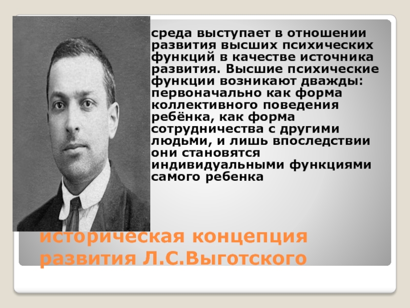 в качестве источника развития. Высшие психические функции возникают дважды: первоначально как форма коллективного поведения ребёнка, как форма сотрудничества с другими людьми, и лишь впоследствии они становятся индивидуальными функциями самого ребенка