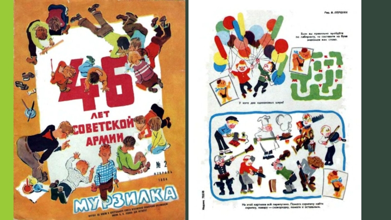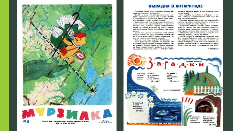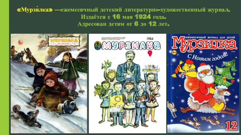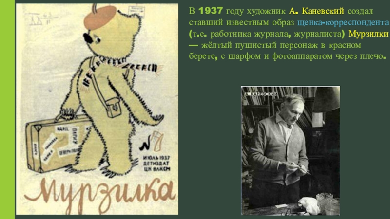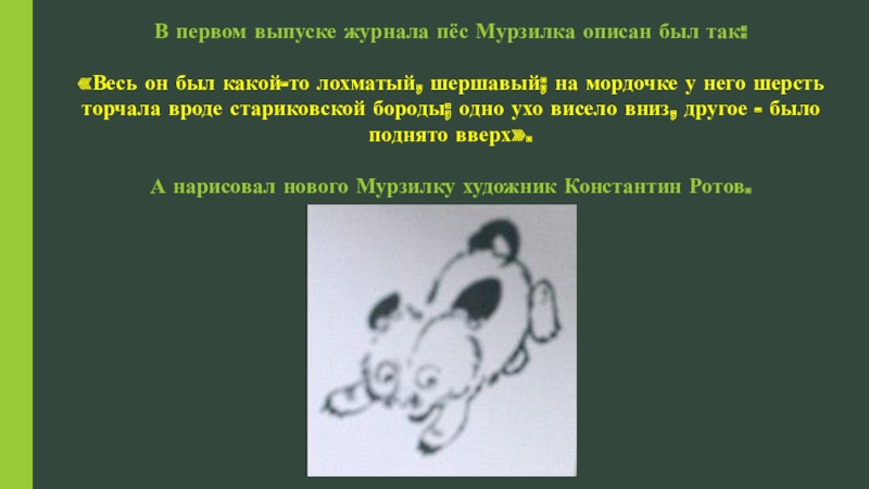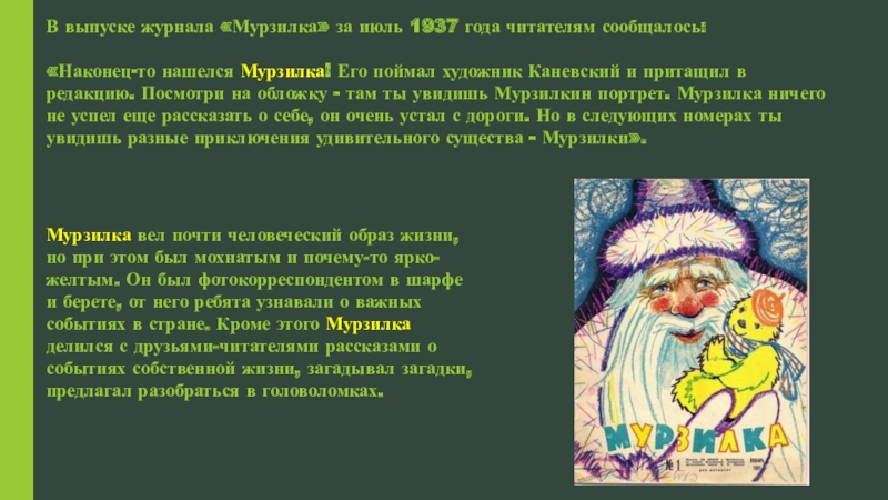 Мурзилка вел почти человеческий образ жизни, но при этом был мохнатым и почему-то ярко-желтым. Он был фотокорреспондентом в шарфе и берете, от него ребята узнавали о важных событиях в стране. Кроме этого Мурзилка делился с друзьями-читателями рассказами о событиях собственной жизни, загадывал загадки, предлагал разобраться в головоломках.