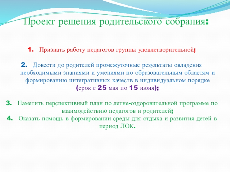 Слайд 46Признать работу педагогов группы удовлетворительной;