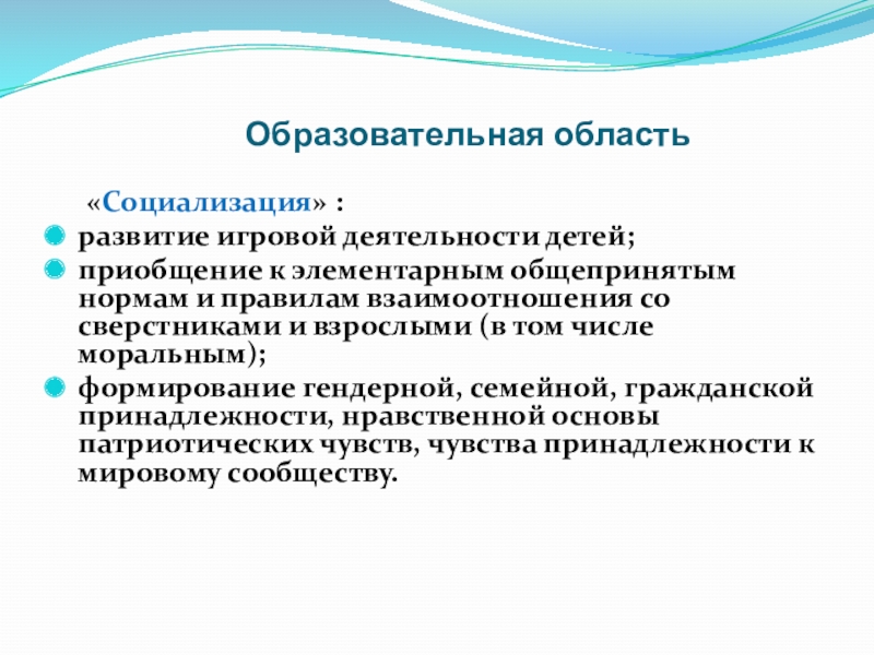 формирование гендерной, семейной, гражданской принадлежности, нравственной основы патриотических чувств, чувства принадлежности к мировому сообществу.