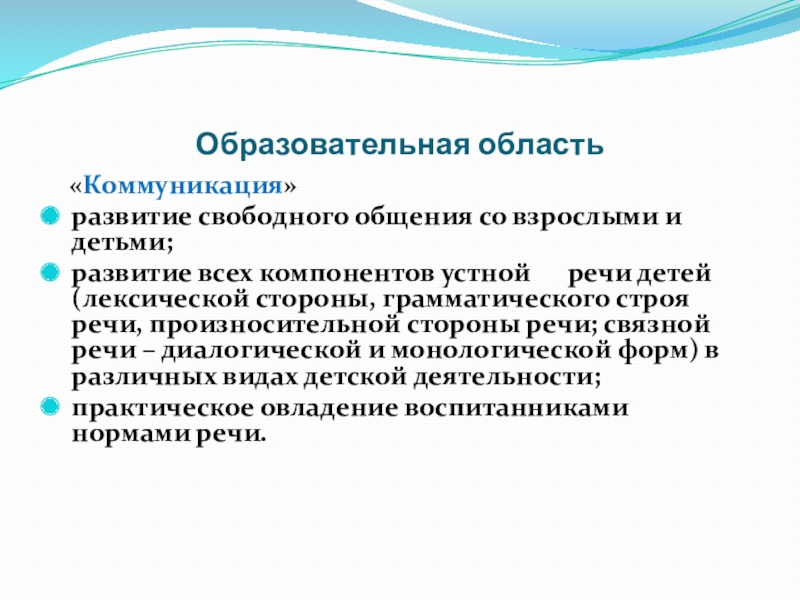 компонентов устной речи детей (лексической стороны, грамматического строя речи, произносительной стороны речи; связной речи – диалогической и монологической форм) в различных видах детской деятельности;