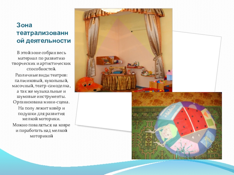 Различные виды театров: пальчиковый, кукольный, масочный, театр-самоделка, а так же музыкальные и шумовые инструменты. Организована мини-сцена.