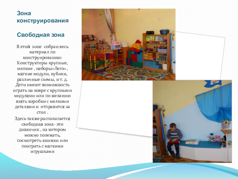 Конструкторы крупные, мелкие , наборы»Лего», мягкие модули, кубики, различные схемы, и т. д. Дети имеют возможность играть на ковре с крупными модулями или по желанию взять коробки с мелкими деталями и отправится за стол .