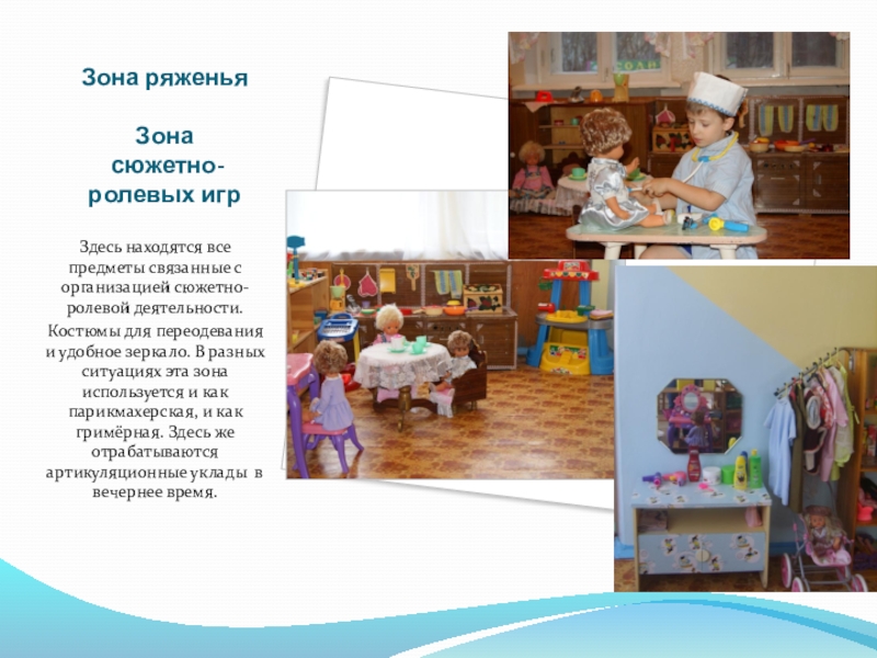 Костюмы для переодевания и удобное зеркало. В разных ситуациях эта зона используется и как парикмахерская, и как гримёрная. Здесь же отрабатываются артикуляционные уклады в вечернее время.