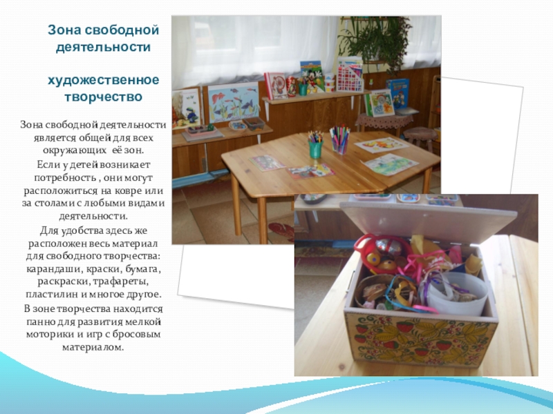 Для удобства здесь же расположен весь материал для свободного творчества: карандаши, краски, бумага, раскраски, трафареты, пластилин и многое другое.