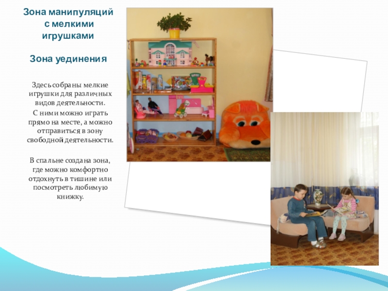 Здесь также располагается свободная зона- это диванчик , на котором можно полежать, посмотреть книжки или поиграть с мягкими игрушками