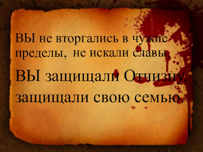 ВЫ защищали Отчизну, защищали свою семью.ВЫ не вторгались в чужие пределы,не искали славы,