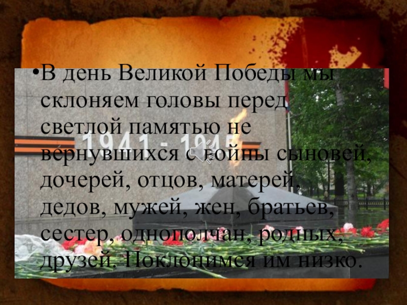 Слайд 15В день Великой Победы мы склоняем головы перед светлой памятью не