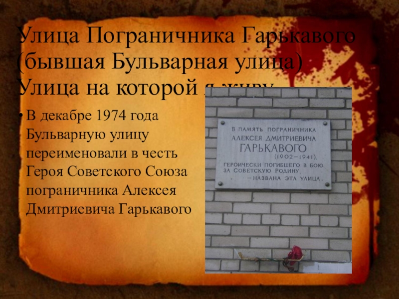 Слайд 14Улица Пограничника Гарькавого (бывшая Бульварная улица) Улица на которой я живу
