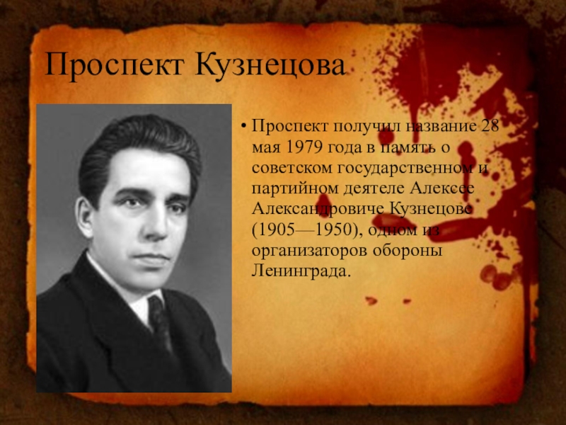 советском государственном и партийном деятеле Алексее Александровиче Кузнецове(1905—1950), одном из организаторов обороны Ленинграда.
