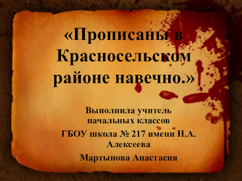 «Прописаны в Красносельском районе навечно.»Выполнила учитель начальных классовГБОУ школа № 217 имени Н.А.АлексееваМартынова Анастасия