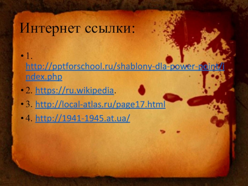 Интернет ссылки:1. http://pptforschool.ru/shablony-dla-power-point/index.php2. https://ru.wikipedia.3. http://local-atlas.ru/page17.html4. http://1941-1945.at.ua/