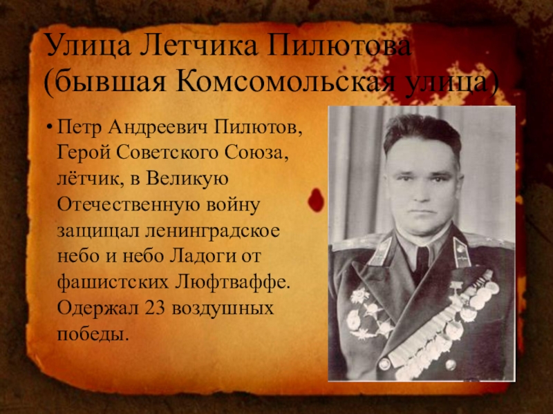 Улица Летчика Пилютова (бывшая Комсомольская улица)Петр Андреевич Пилютов, Герой Советского Союза, лётчик, в Великую Отечественную войну защищал