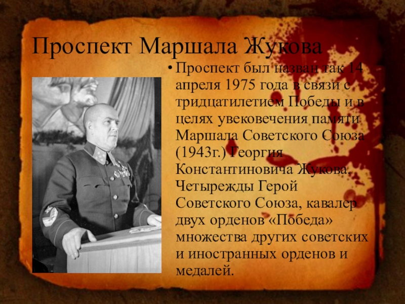 Проспект Маршала ЖуковаПроспект был назван так 14 апреля 1975 года в связи с тридцатилетием Победы и в