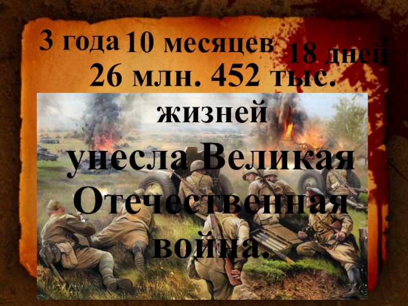3 года 10 месяцев18 дней 26 млн. 452 тыс. жизнейунесла Великая Отечественная война.