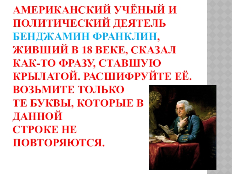 Американский учёный и политический деятель Бенджамин Франклин, живший в 18 веке, сказал как-то фразу, ставшую крылатой. Расшифруйте