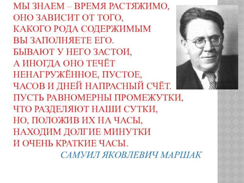 его. Бывают у него застои, А иногда оно течёт Ненагружённое, пустое, Часов и дней напрасный счёт. Пусть равномерны промежутки, Что разделяют наши сутки, Но, положив их на часы, Находим долгие минутки И очень краткие часы. Самуил Яковлевич Маршак