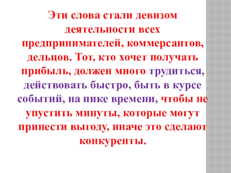 Слайд 9Эти слова стали девизом деятельности всех предпринимателей, коммерсантов, дельцов. Тот, кто
